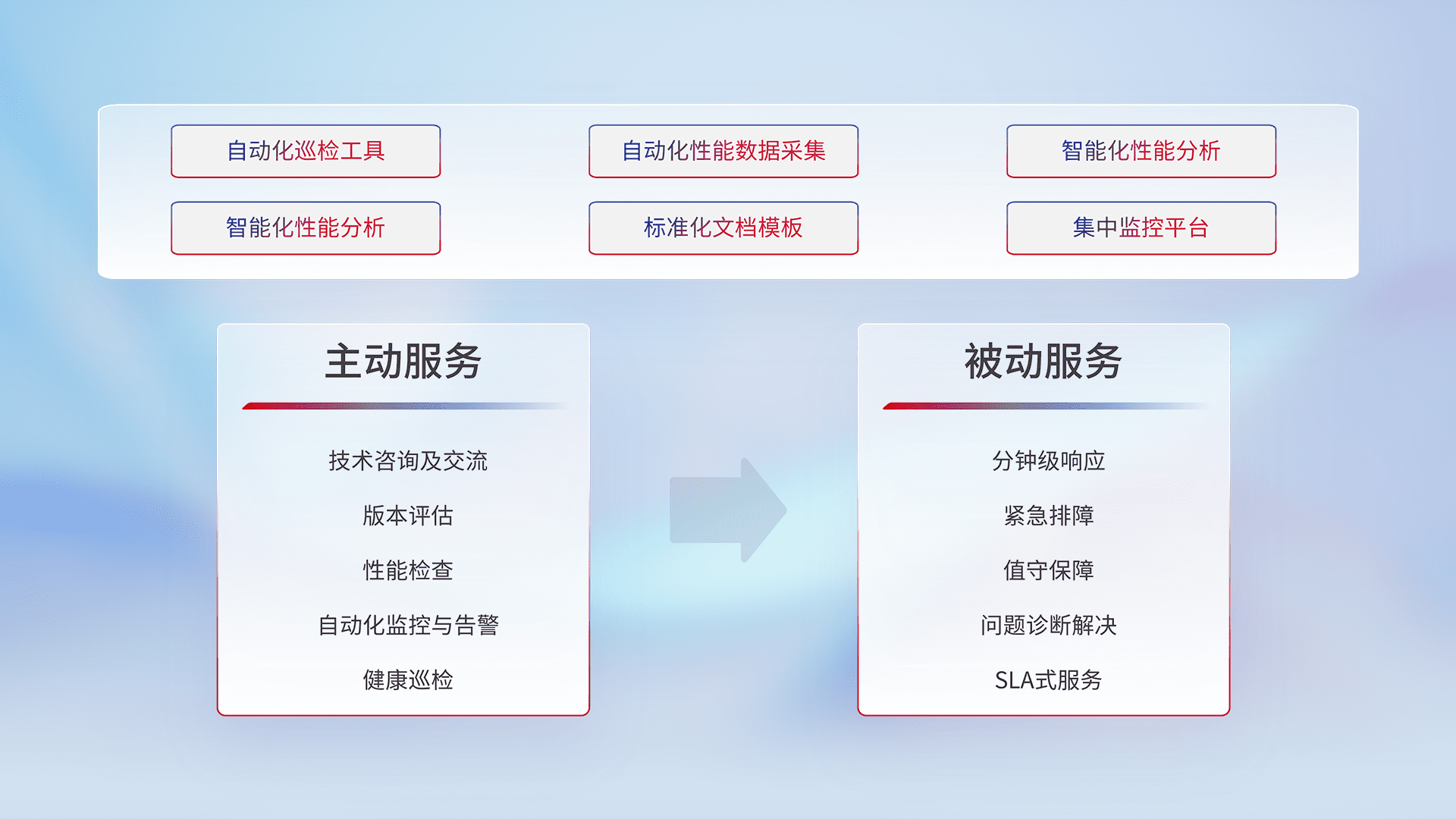 智能化工具和标准化文档,,,保障服务质量,,,提供主动服务(包含技术咨询、、、、版本评估、、、性能检查、、、自动化监控与告警、、、健康巡检)和被动服务包含(分钟级响应、、紧急排障、、值守保障、、问题诊断解决、、、SLA服务)。。
